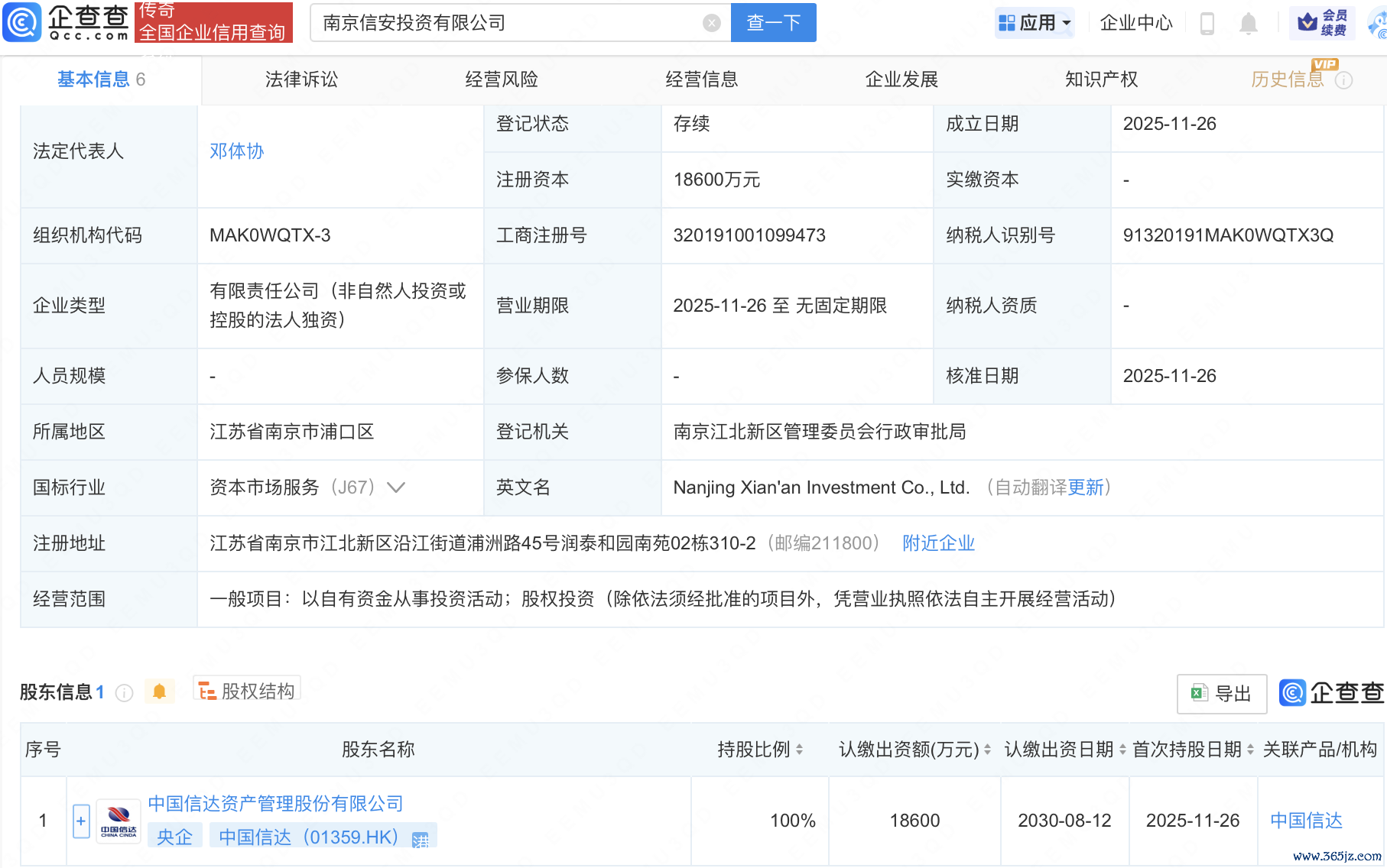 近日,南京信安投资有限公司成立三羊财务,注册资本1.86亿元,经营范围包含:以自有资金从事投资活动;股权投资。企查查股权穿透显示,该公司由中国信达(01359.HK)全资持股。
