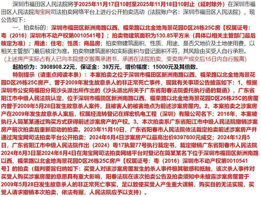 法院公告提示,本案拍卖的位于深圳市福田区新洲南路以西、福荣路以北金地海景花园D区26栋25C房产,曾于2009年发生故意杀人的非正常死亡事件。涉案房产在2009年发生故意杀人案后,权属经流转登记在辉宏机电工程(深圳)有限公司名下;2016年,简某某通过购买方式获得涉案房产的产权。此后,浙商银行股份有限公司深圳分行因与简某某等人有借款合同,法院依法强制对简某某上述房产进行拍卖、变卖。2023年11月10日,广东省阳春市人民法院依法裁定公开拍卖涉案房产;2024年6月4日该处房产以最高出价8397600元成交。同年12月5日,该拍卖交易被广东省阳江市中级人民法院裁定撤销。