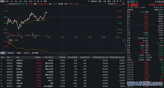 化工板块今日(3月11日)盘中拉升,反映化工板块整体走势的化工ETF(516020)开盘后持续低位震荡,盘中场内价格一度跌1%,而后拉升翻红,截至发稿,涨0.3%。